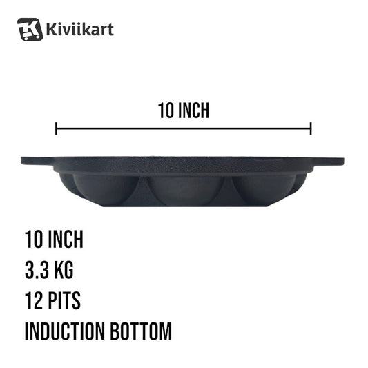 Pre-Seasoned Cast Iron Paniyaram Pan, Appe Pan, Appam Maker, Ponganalu Pan, litti Maker, Non Stick Paddu tawa 12 Cavity, Gas and Induction Friendly, 25.4cm, Black